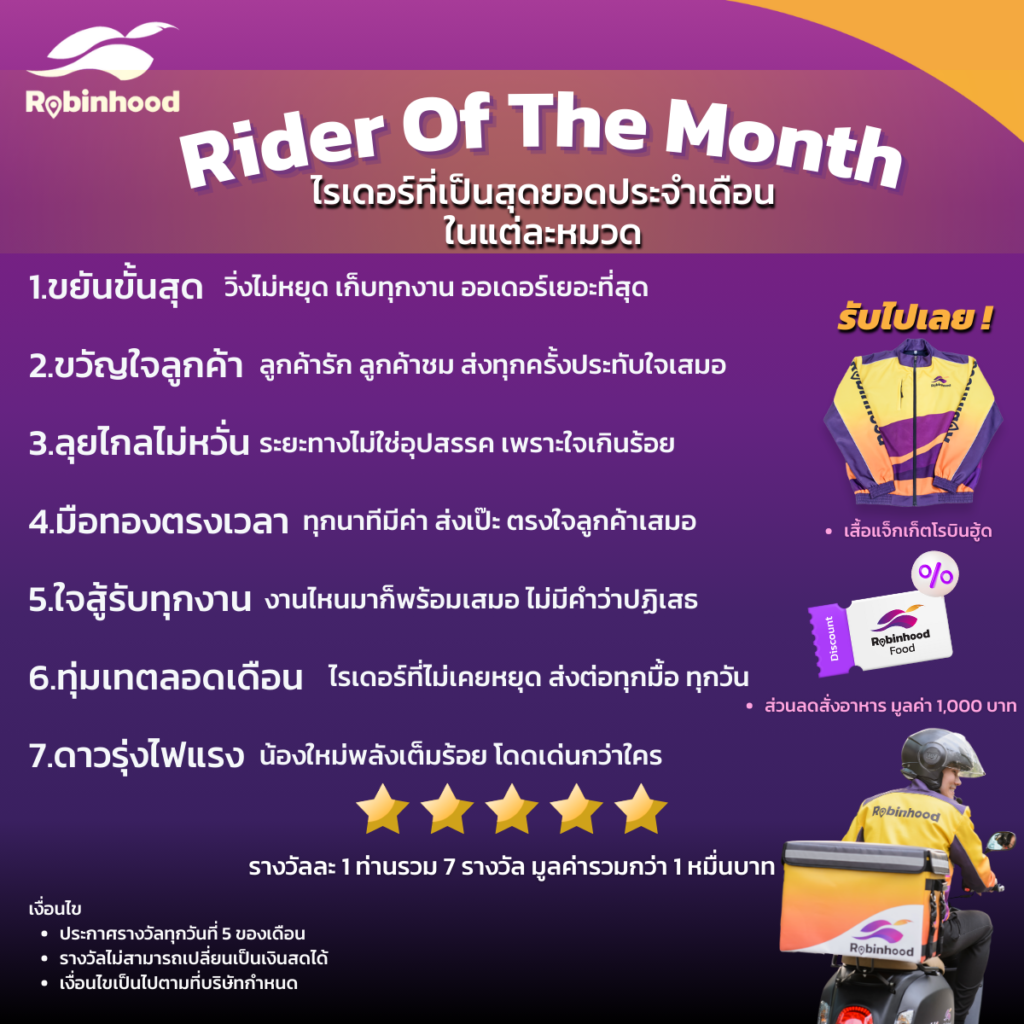 เสื้อแจ็กเก็ตโรบินฮู้ด มูลค่า 390 บาท และคูปองส่วนลดสั่งอาหารโรบินฮู้ดมูลค่า 1,000 บาท (คูปอง 200 บาท 5 โค้ด)